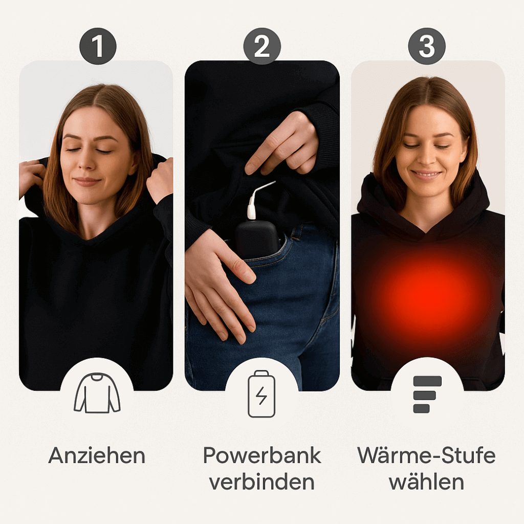 Der Hoodie wurde entwickelt, um täglich und zuverlässig verwendet zu werden — drinnen und draußen. Bei elektrischen Heiztextilien gilt immer: Vor dem Waschen die Powerbank entfernen.